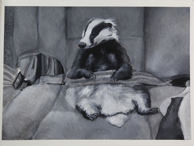 This grayscale acrylic painting depicts a badger buckled into the backseat of a car. This piece is part of an acrylic painting series exploring the humor of animals' interactions with human environments.